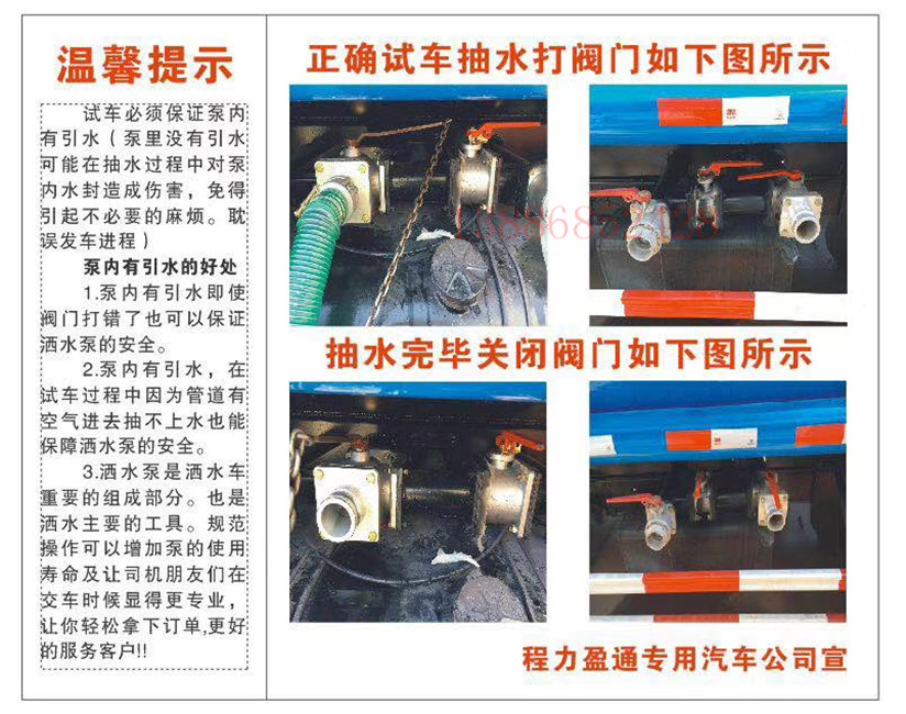 灑水車車載水泵的正常使用和常規(guī)保養(yǎng),隨著國內(nèi)經(jīng)濟的高速發(fā)展,國家對環(huán)保越來越重視,灑水車已經(jīng)普及到村鎮(zhèn)甚至各個廠和小區(qū),但是如何正確使用灑水車,好多司機朋友還沒有正真了解。為了避免因一些小問題而影響灑水效果,灑水車車載水泵的正常使用和常規(guī)保養(yǎng),湖北盈通專汽友情提示廣大司機朋友,注意以下問題,敬請惠存!!!