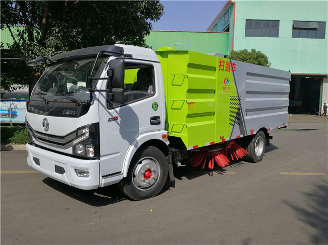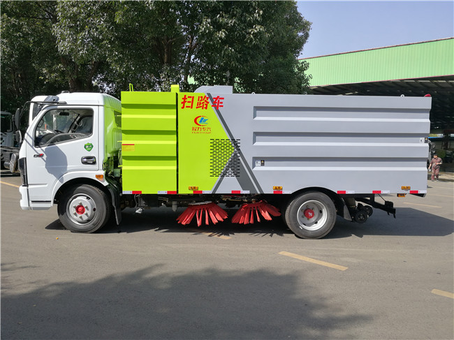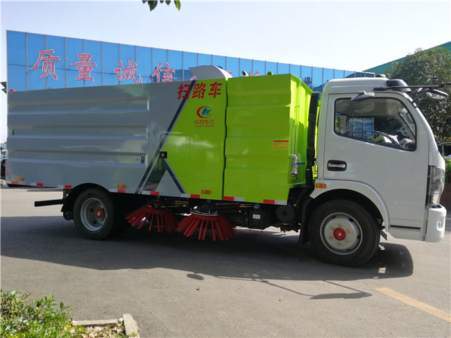該掃路車采用東風(fēng)大多利卡二類底盤改裝,加裝副發(fā)動(dòng)機(jī)、風(fēng)機(jī)、清水箱、垃圾箱、左右立掃、掃盤降塵系統(tǒng),液壓系統(tǒng)、專用裝置電控系統(tǒng)和副車架等改裝而成。