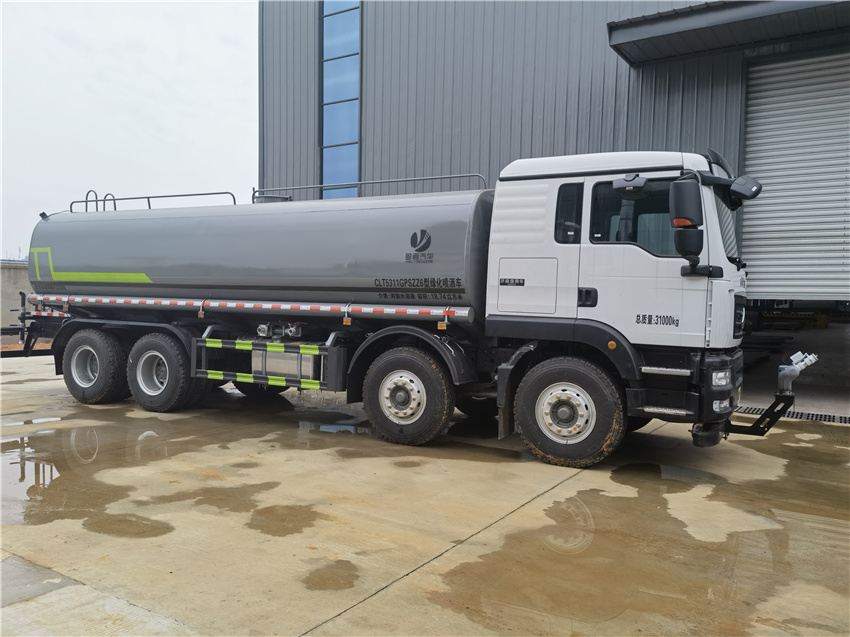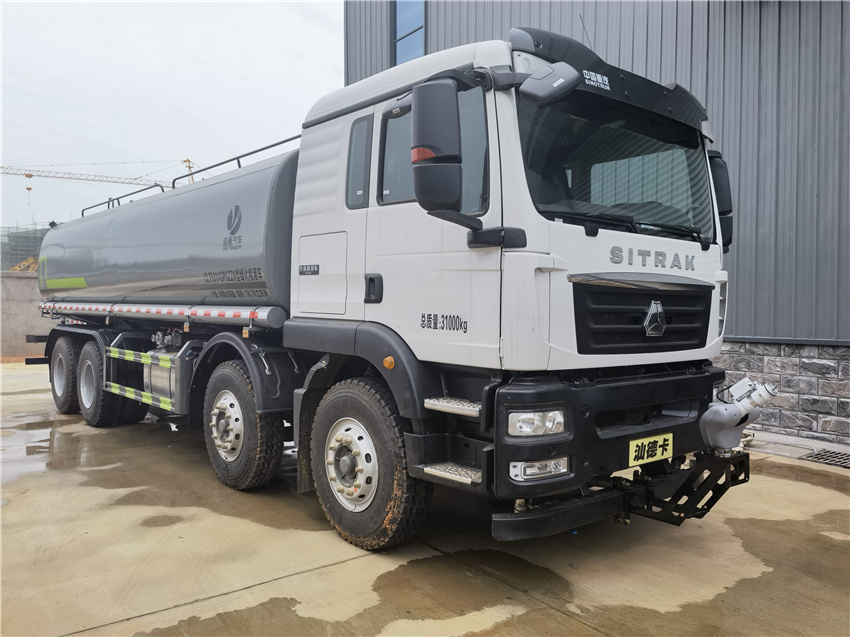 汕德卡25方灑水車_重汽8x4灑水車_國六25方灑水車_前四后八灑水車價格,該車主要用于城鄉園林綠化噴灑作業.主要裝置為罐體及噴灑裝置;罐體總容量:19.67立方米;罐體有效容積:18.74立方米;罐體外形尺寸(長×長軸×短軸)(mm):7300×2450×1650.僅采用軸距(mm):1800+3800+1350改裝.側、后防護材料均為:Q235碳鋼,連接方式均為:螺栓連接,后部防護截面尺寸(mm):120×50,后部防護離地高度(mm):490.ABS系統控制器生產企業/型號為采埃孚商用車系統(青島)有限公司/4460046300;隨底盤選裝駕駛室,選裝噴霧裝置樣式,選裝自動球閥安裝位置,選裝弧形噴灑裝置,選裝箭頭燈裝置,選裝大工作平臺,選裝前部不帶電子霧炮.選裝電子炮裝置樣式.當前部選裝電子炮裝置時,前伸為500mm,整車長度為11560mm,11750mm.隨底盤選裝限速裝置,限速89km/h. |